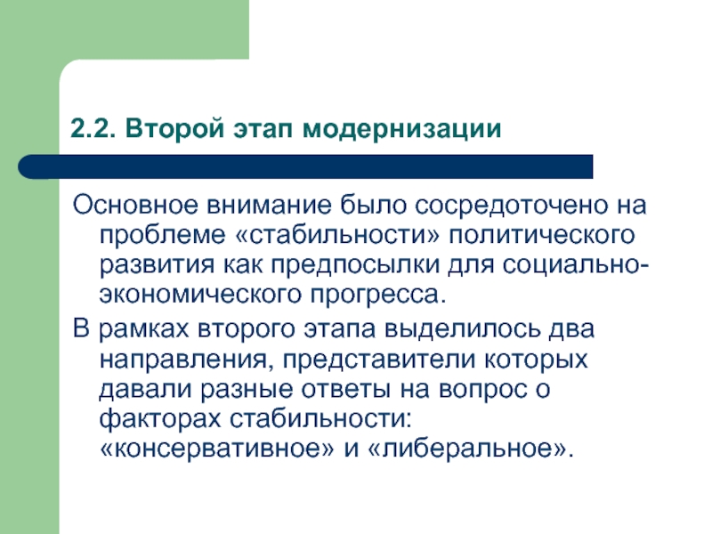 В рамках второго этапа выделилось два направления, представители которых давали разные ответы на вопрос о факторах стабильности: «консервативное» и «либеральное».