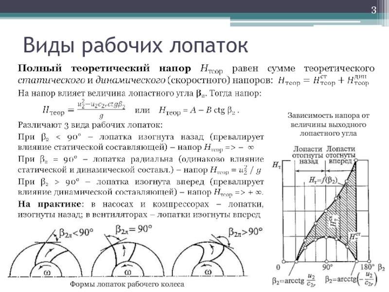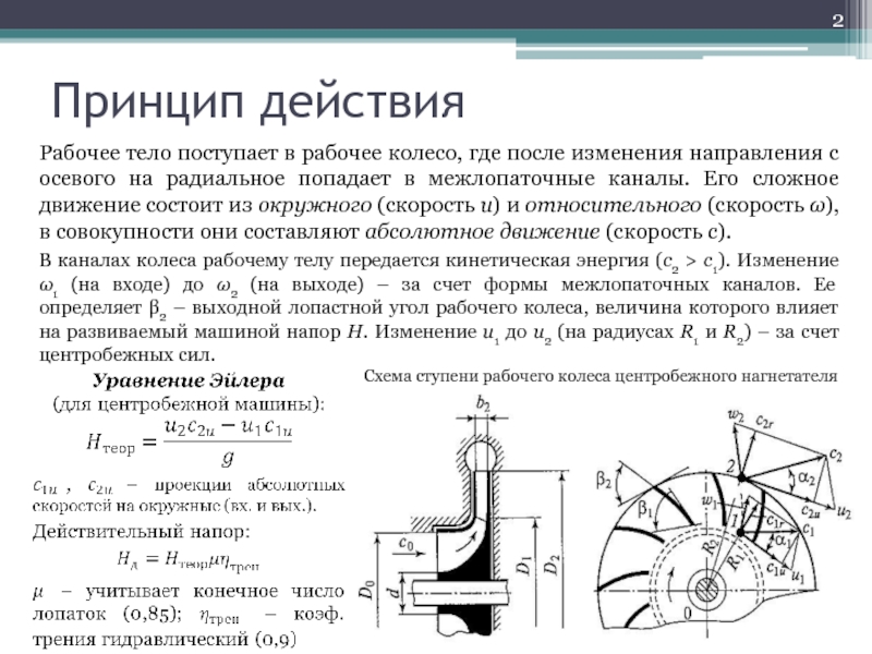 В каналах колеса рабочему телу передается кинетическая энергия (с2 > с1). Изменение ω1 (на входе) до ω2 (на выходе) – за счет формы межлопаточных каналов. Ее определяет β2 – выходной лопастной угол рабочего колеса, величина которого влияет на развиваемый машиной напор H. Изменение u1 до u2 (на радиусах R1 и R2) – за счет центробежных сил.