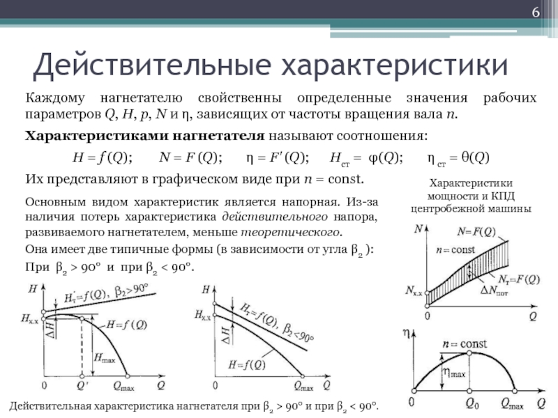 Действительная характеристика нагнетателя при β2 > 90° и при β2 < 90°.