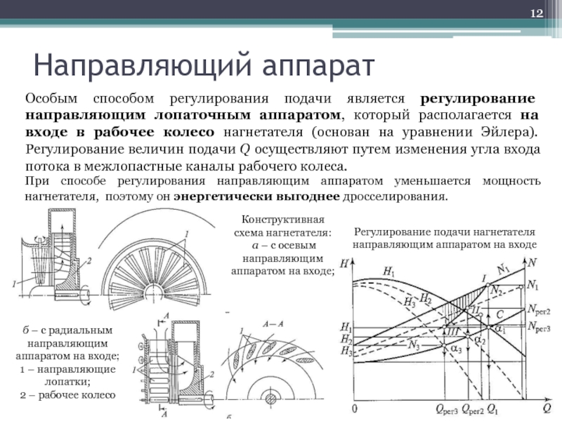 При способе регулирования направляющим аппаратом уменьшается мощность нагнетателя, поэтому он энергетически выгоднее дросселирования.