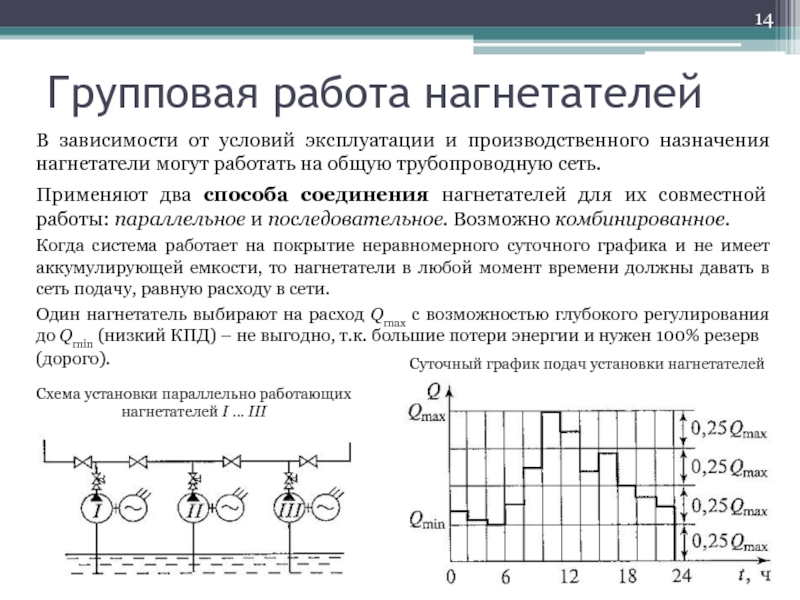 Один нагнетатель выбирают на расход Qmax с возможностью глубокого регулирования до Qmin (низкий КПД) – не выгодно, т.к. большие потери энергии и нужен 100% резерв