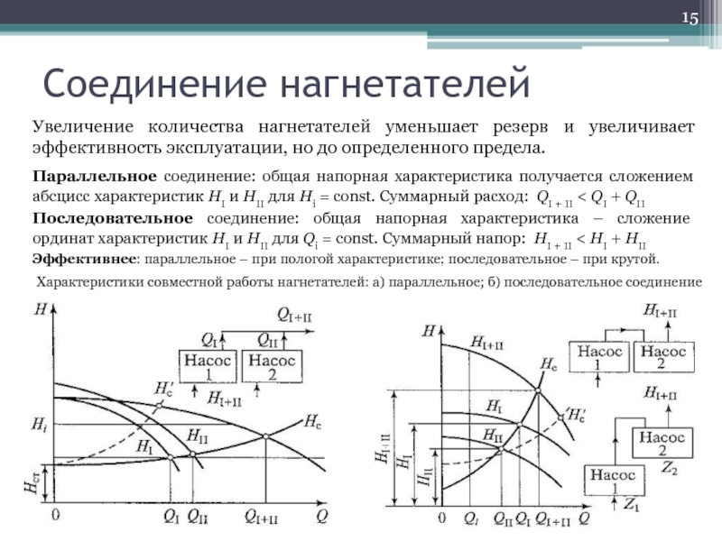 Последовательное соединение: общая напорная характеристика – сложение ординат характеристик HI и HII для Qi = const. Суммарный напор: HI + II < HI + HII