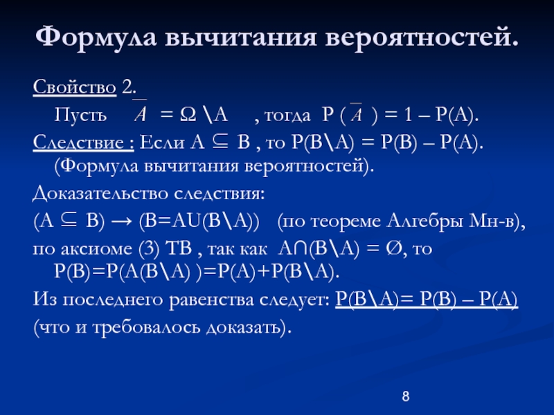 Следствие : Если А ⊆ B , то P(B\A) = P(B) – P(A). (Формула вычитания вероятностей).