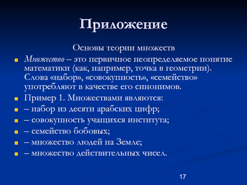 например, точка в геометрии). Слова «набор», «совокупность», «семейство» употребляют в качестве его синонимов.