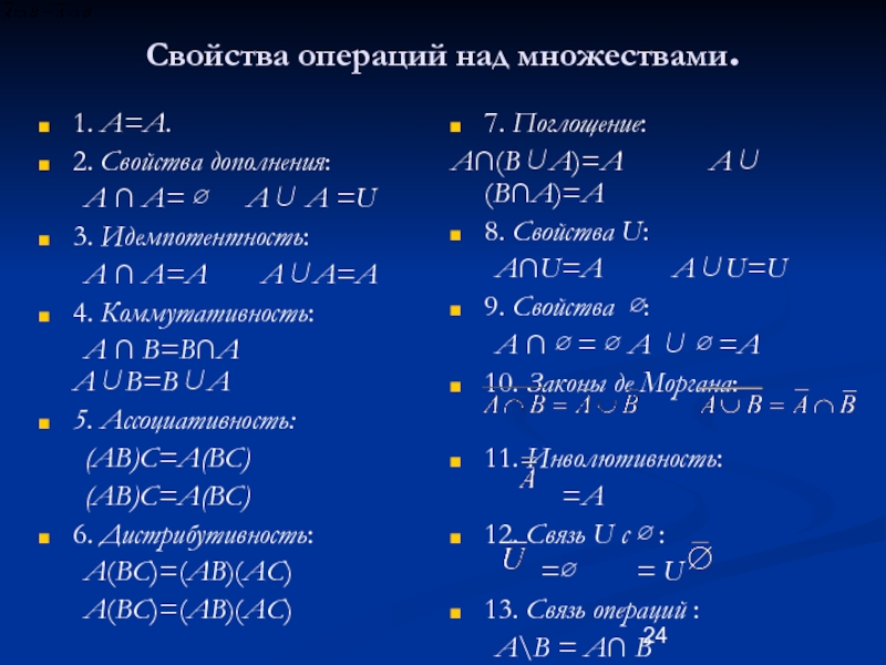 Слайд 24Свойства операций над множествами.