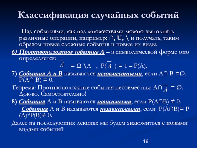 например: ∩, U, \ и получать, таким образом новые сложные события и новые их виды.