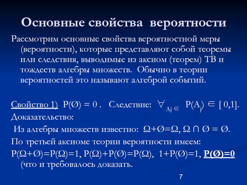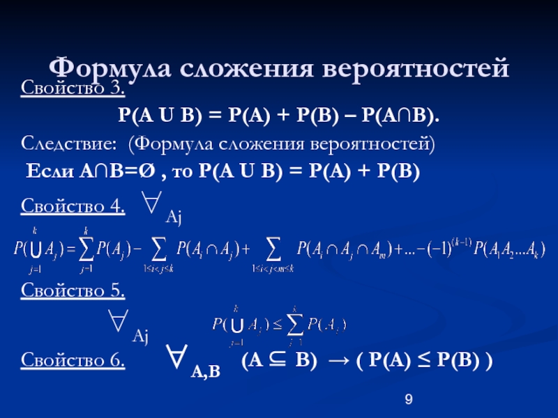 Свойство 1) P(Ø) = 0 . Следствие: ∀Aj ∈ P(Aj) ∈ [ 0,1].