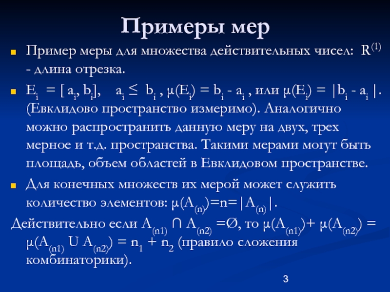 Ei = [ ai, bi], ai ≤ bi , μ(Еi) = bi - ai , или μ(Еi) = |bi - ai |. (Евклидово пространство измеримо). Аналогично можно распространить данную меру на двух, трех мерное и т.д. пространства. Такими мерами могут быть площадь, объем областей в Евклидовом пространстве.