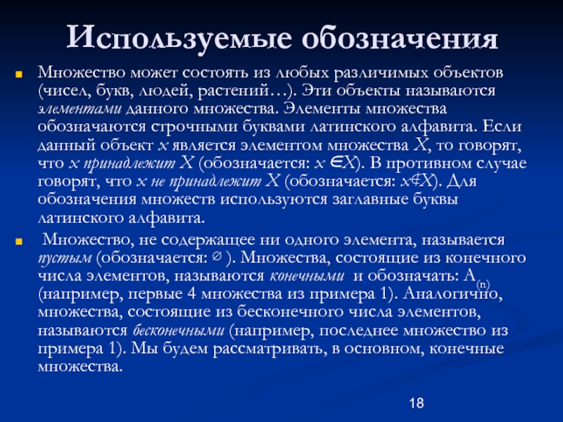 растений…). Эти объекты называются элементами данного множества. Элементы множества обозначаются строчными буквами латинского алфавита. Если данный объект x является элементом множества X, то говорят, что x принадлежит X (обозначается: x ∈X). В противном случае говорят, что x не принадлежит X (обозначается: x∉X). Для обозначения множеств используются заглавные буквы латинского алфавита.