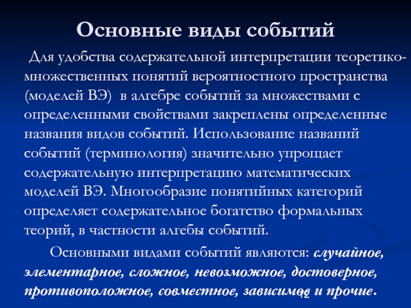 ВЭ) в алгебре событий за множествами с определенными свойствами закреплены определенные названия видов событий. Использование названий событий (терминология) значительно упрощает содержательную интерпретацию математических моделей ВЭ. Многообразие понятийных категорий определяет содержательное богатство формальных теорий, в частности алгебы событий.