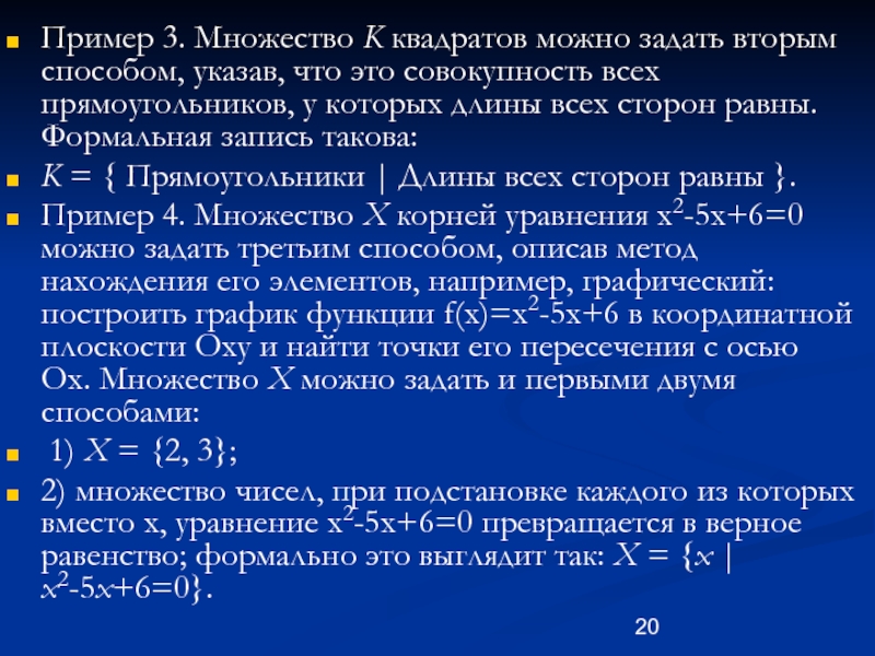Слайд 20Пример 3. Множество K квадратов можно задать вторым способом, указав, что