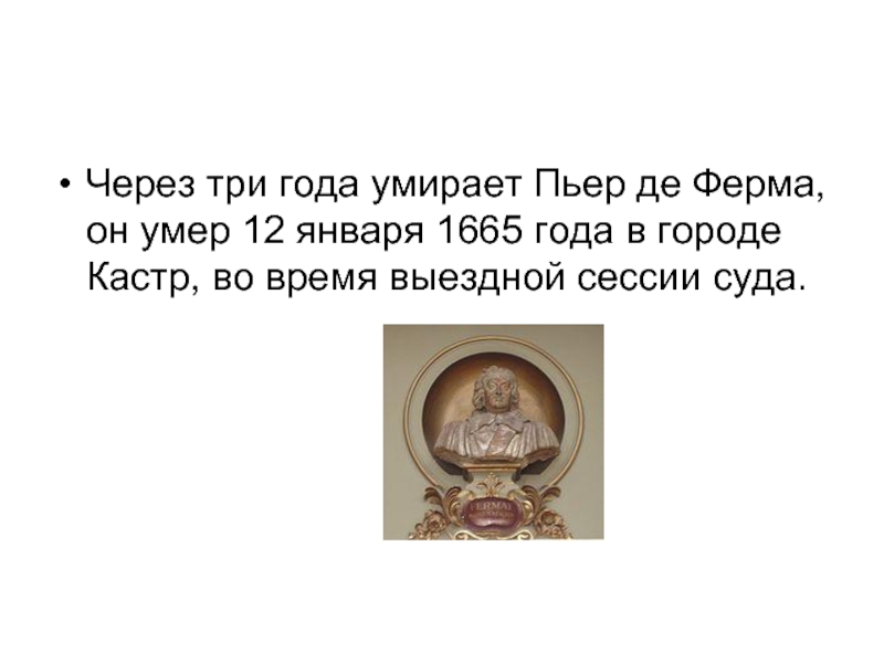 Через три года умирает Пьер де Ферма, он умер 12 января