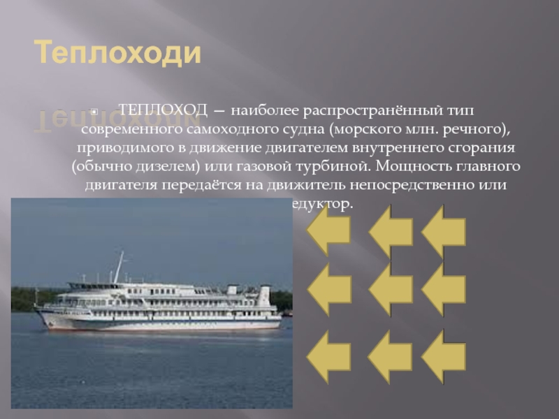 Теплоход - судно, приводимое в движение двигателем внутреннего сгорания (дизелем) или
