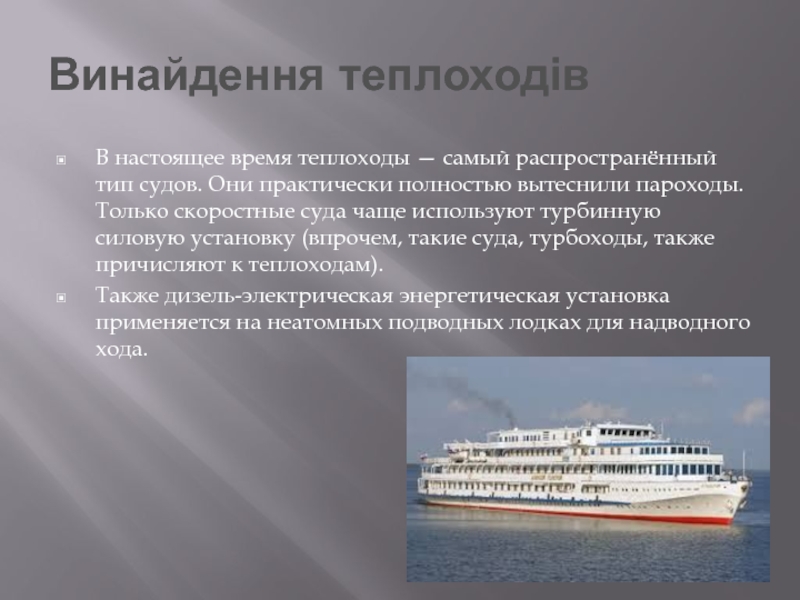 Слайд 1Теплоходи: винайдення історія теплоходів будуванння теплоходів