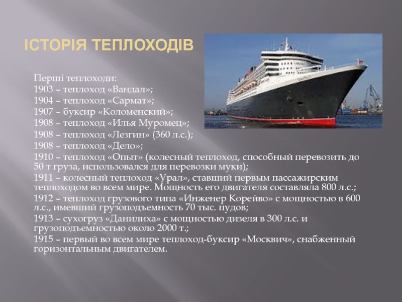 Слайд 7ІСТОРІЯ ТЕПЛОХОДІВ