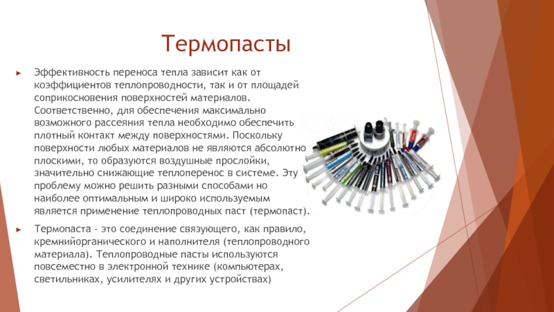 площадей соприкосновения поверхностей материалов. Соответственно, для обеспечения максимально возможного рассеяния тепла необходимо обеспечить плотный контакт между поверхностями. Поскольку поверхности любых материалов не являются абсолютно плоскими, то образуются воздушные прослойки, значительно снижающие теплоперенос в системе. Эту проблему можно решить разными способами но наиболее оптимальным и широко используемым является применение теплопроводных паст (термопаст).