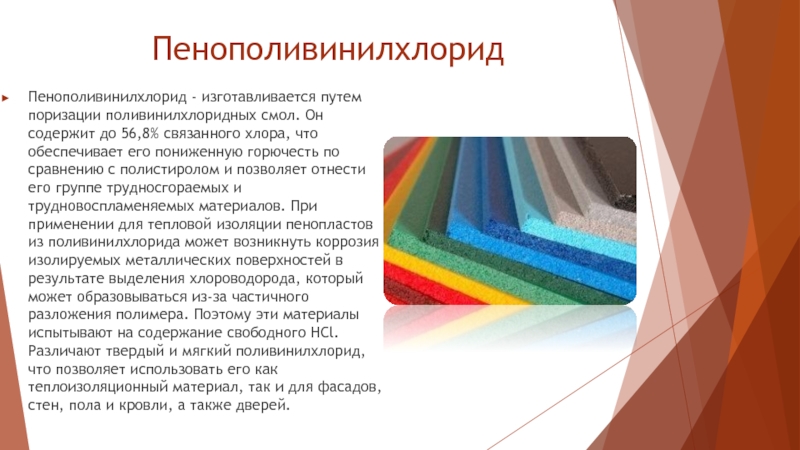 связанного хлора, что обеспечивает его пониженную горючесть по сравнению с полистиролом и позволяет отнести его группе трудносгораемых и трудновоспламеняемых материалов. При применении для тепловой изоляции пенопластов из поливинилхлорида может возникнуть коррозия изолируемых металлических поверхностей в результате выделения хлороводорода, который может образовываться из-за частичного разложения полимера. Поэтому эти материалы испытывают на содержание свободного HCl. Различают твердый и мягкий поливинилхлорид, что позволяет использовать его как теплоизоляционный материал, так и для фасадов, стен, пола и кровли, а также дверей.