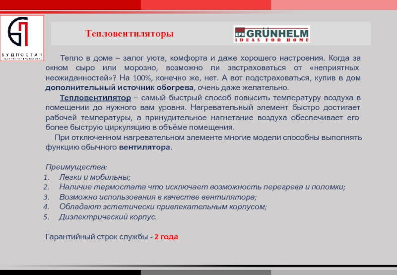 Тепловентилятор – самый быстрый способ повысить температуру воздуха в помещении до нужного вам уровня. Нагревательный элемент быстро достигает рабочей температуры, а принудительное нагнетание воздуха обеспечивает его более быструю циркуляцию в объёме помещения.