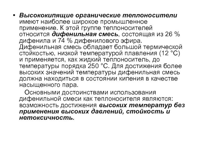 теплоносителей относится дифенильная смесь, состоящая из 26 % дифенила и 74 % дифенилового эфира. Дифенильная смесь обладает большой термической стойкостью, низкой температурой плавления (12 °С) и применяется, как жидкий теплоноситель, до температуры порядка 250 °С. Для достижения более высоких значений температуры дифенильная смесь должна находиться в состоянии кипения в качестве насыщенного пара.