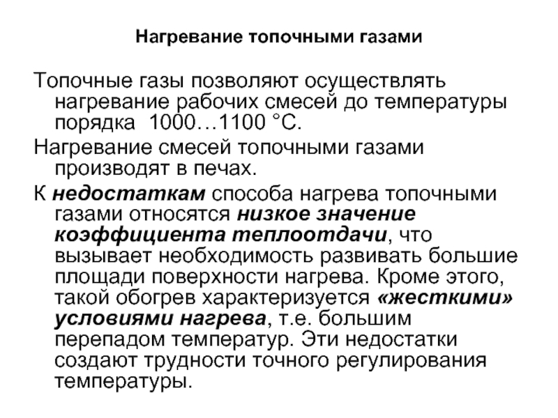 К недостаткам способа нагрева топочными газами относятся низкое значение коэффициента теплоотдачи, что вызывает необходимость развивать большие площади поверхности нагрева. Кроме этого, такой обогрев характеризуется «жесткими» условиями нагрева, т.е. большим перепадом температур. Эти недостатки создают трудности точного регулирования температуры.