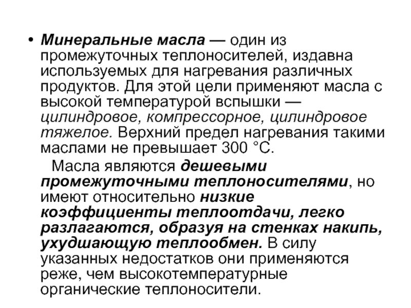 Масла являются дешевыми промежуточными теплоносителями, но имеют относительно низкие коэффициенты теплоотдачи, легко разлагаются, образуя на стенках накипь, ухудшающую теплообмен. В силу указанных недостатков они применяются реже, чем высокотемпературные органические теплоносители.
