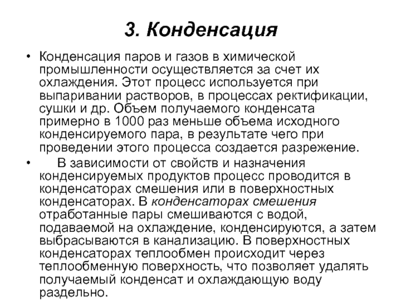 их охлаждения. Этот процесс используется при выпаривании растворов, в процессах ректификации, сушки и др. Объем получаемого конденсата примерно в 1000 раз меньше объема исходного конденсируемого пара, в результате чего при проведении этого процесса создается разрежение.