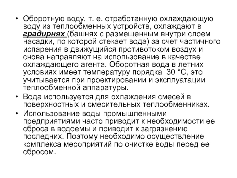 в градирнях (башнях с размещенным внутри слоем насадки, по которой стекает вода) за счет частичного испарения в движущийся противотоком воздух и снова направляют на использование в качестве охлаждающего агента. Оборотная вода в летних условиях имеет температуру порядка 30 °С, это учитывается при проектировании и эксплуатации теплообменной аппаратуры.