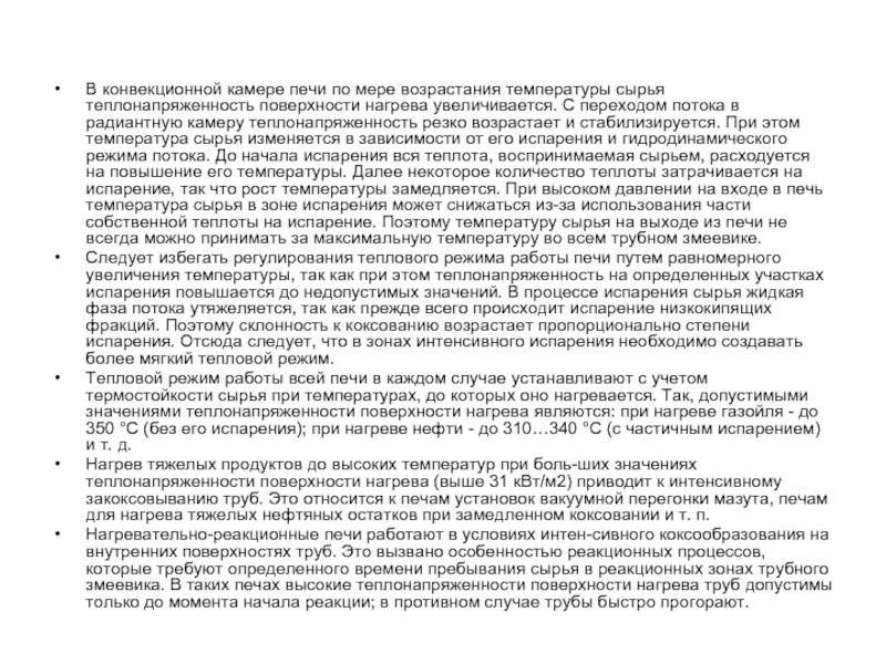 Тепловой режим работы всей печи в каждом случае устанавливают с учетом термостойкости сырья при температурах, до которых оно нагревается. Так, допустимыми значениями теплонапряженности поверхности нагрева являются: при нагреве газойля - до 350 °С (без его испарения); при нагреве нефти - до 310…340 °С (с частичным испарением) и т. д.