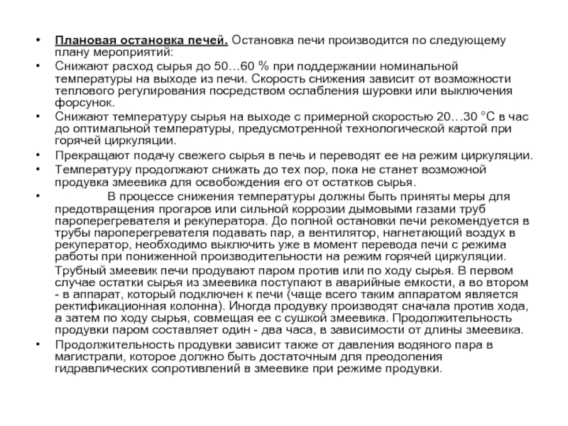 сырья до 50…60 % при поддержании номинальной температуры на выходе из печи. Скорость снижения зависит от возможности теплового регулирования посредством ослабления шуровки или выключения форсунок.