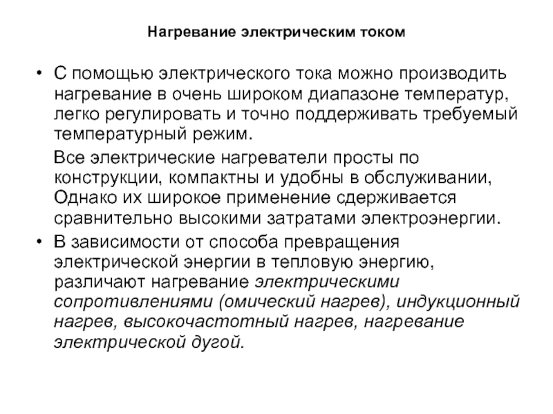В зависимости от способа превращения электрической энергии в тепловую энергию, различают нагревание электрическими сопротивлениями (омический нагрев), индукционный нагрев, высокочастотный нагрев, нагревание электрической дугой.