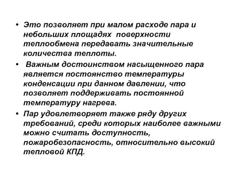 Важным достоинством насыщенного пара является постоянство температуры конденсации при данном давлении, что позволяет поддерживать постоянной температуру нагрева.