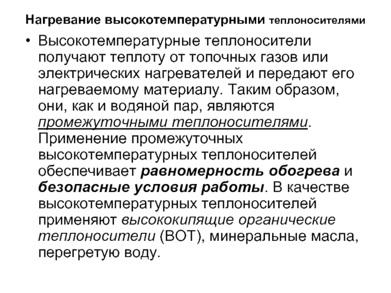 нагревателей и передают его нагреваемому материалу. Таким образом, они, как и водяной пар, являются промежуточными теплоносителями. Применение промежуточных высокотемпературных теплоносителей обеспечивает равномерность обогрева и безопасные условия работы. В качестве высокотемпературных теплоносителей применяют высококипящие органические теплоносители (ВОТ), минеральные масла, перегретую воду.