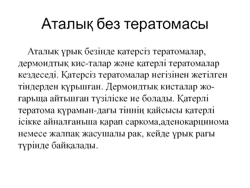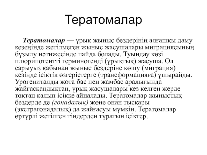 тератомалар кездеседі. Қатерсіз тератомалар негізінен жетілген тіндерден қүрьшған. Дермоидтық кисталар жо-ғарьща айтьшған түзіліске ие болады. Қатерлі тератома қүрамын-дағы тіннің қайсысы қатерлі ісікке айналғаньша қарап саркома,аденокарцинома немесе жалпақ жасушалы рак, кейде үрық рагы түрінде байқалады.
