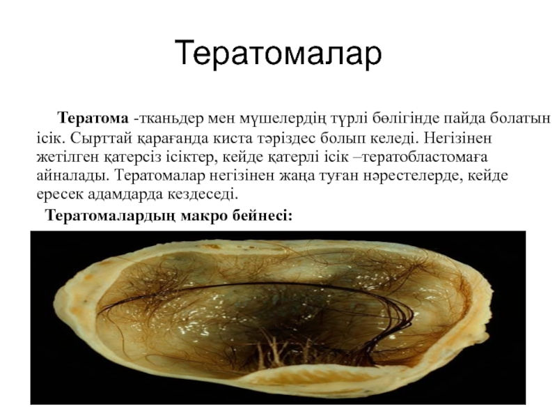 Тератома -тканьдер мен мүшелердің түрлі бөлігінде пайда болатын ісік. Сырттай қарағанда