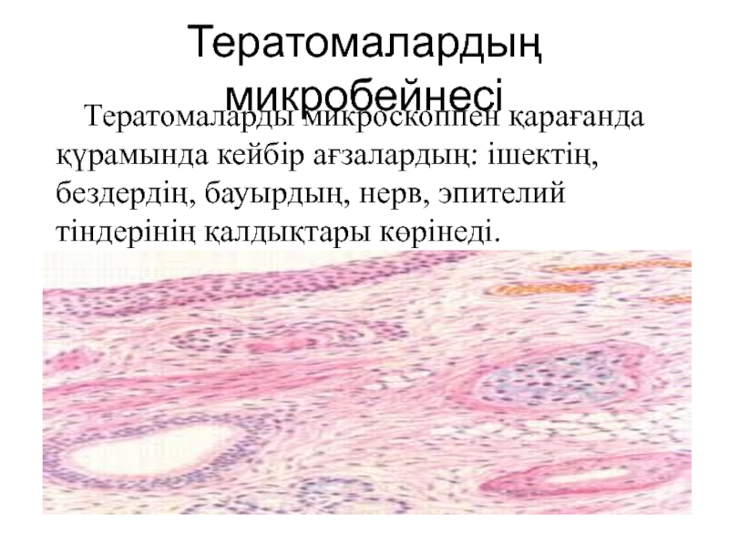 Тератомаларды микроскоппен қарағанда қүрамында кейбір ағзалардың: ішектің, бездердің, бауырдың, нерв,