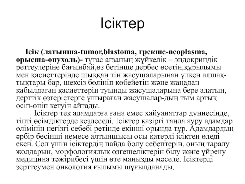 Ісік (латынша-tumor,blastoma, грекше-neoplasma, орысша-опухоль)- тұтас ағзаның жүйкелік – эндокриндік реттеулеріне бағынбай,өз бетінше
