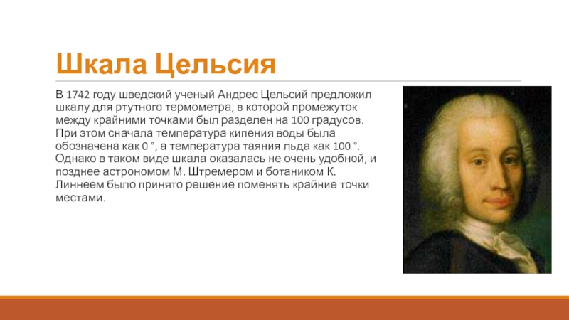 ртутного термометра, в которой промежуток между крайними точками был разделен на 100 градусов. При этом сначала температура кипения воды была обозначена как 0 °, а температура таяния льда как 100 °. Однако в таком виде шкала оказалась не очень удобной, и позднее астрономом М. Штремером и ботаником К. Линнеем было принято решение поменять крайние точки местами.