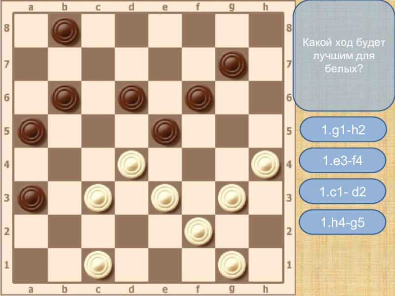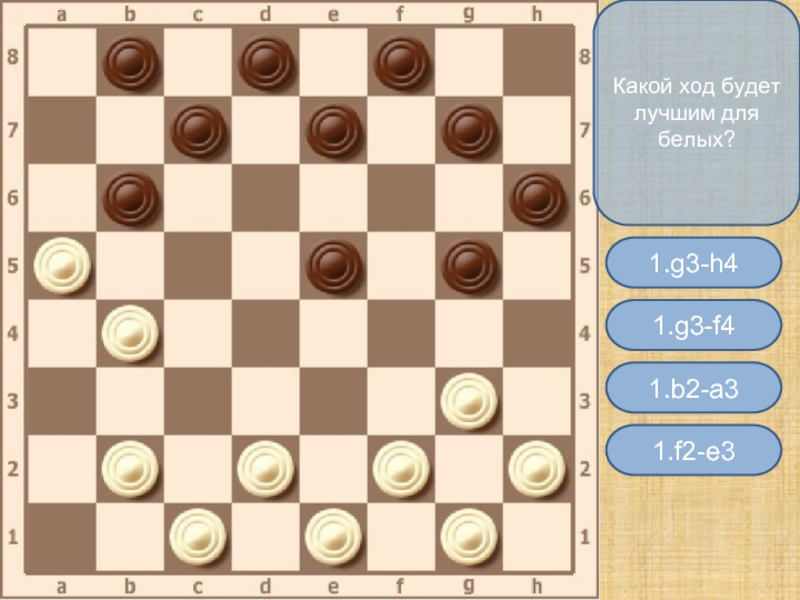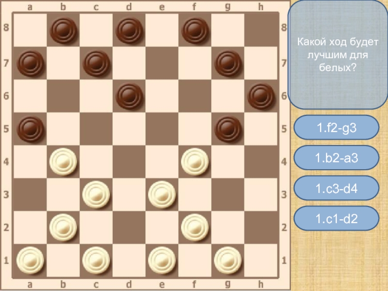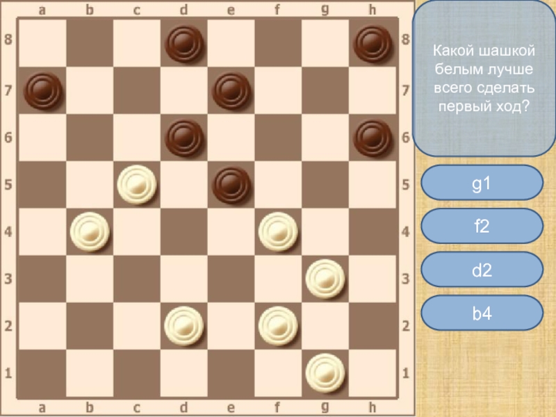 Слайд 1Какой шашкой белым лучше всего сделать первый ход?