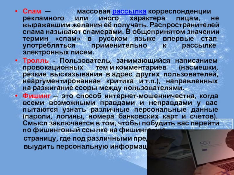 Слайд 5Спам  — массовая рассылка корреспонденции рекламного или иного характера лицам, не выражавшим желания её