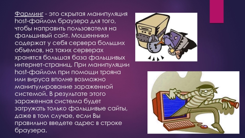 Слайд 14Фарминг - это скрытая манипуляция host-файлом браузера для того, чтобы направить