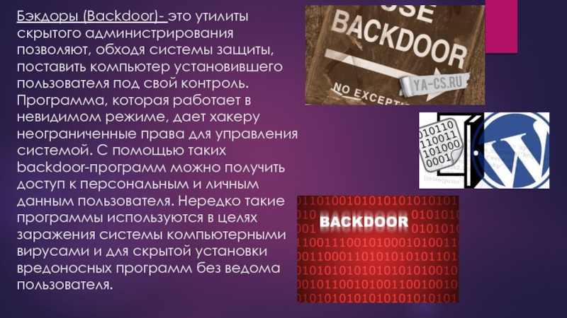 Слайд 3Бэкдоры (Backdoor)- это утилиты скрытого администрирования позволяют, обходя системы защиты, поставить