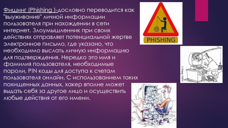 Слайд 15Фишинг (Phishing )-дословно переводится как "выуживание" личной информации пользователя при нахождении