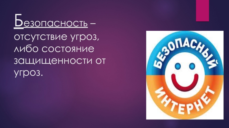 Слайд 2Безопасность – отсутствие угроз, либо состояние защищенности от угроз.