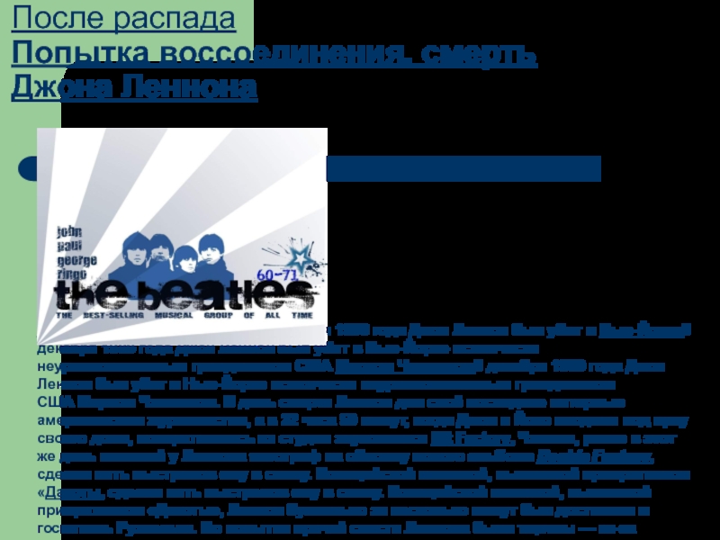 Пол Маккартни планировал воссоединение The Beatles за год до убийства Джона Леннона. В своём контракте 1979 годаПол Маккартни планировал воссоединение The Beatles за год до убийства Джона Леннона. В своём контракте 1979 года с CBS Records Маккартни утверждал, что сможет снова записывать музыку с Ленноном, Харрисоном и Старром под именем The Beatles.