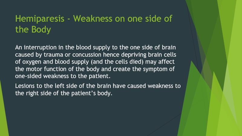 Слайд 15Hemiparesis - Weakness on one side of the Body