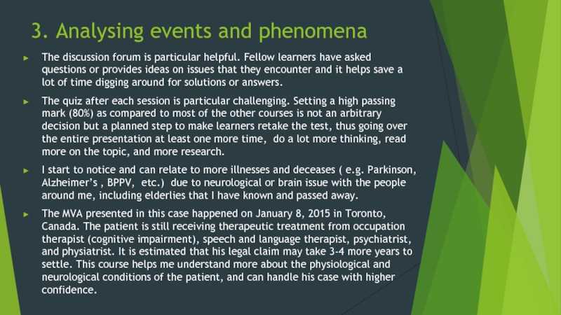 The MVA presented in this case happened on January 8, 2015 in Toronto, Canada. The patient is still receiving therapeutic treatment from occupation therapist (cognitive impairment), speech and language therapist, psychiatrist, and physiatrist. It is estimated that his legal claim may take 3-4 more years to settle. This course helps me understand more about the physiological and neurological conditions of the patient, and can handle his case with higher confidence.