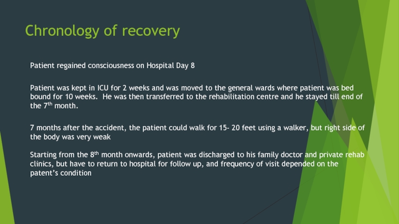 kept in ICU for 2 weeks and was moved to the general wards where patient was bed bound for 10 weeks. He was then transferred to the rehabilitation centre and he stayed till end of the 7th month.