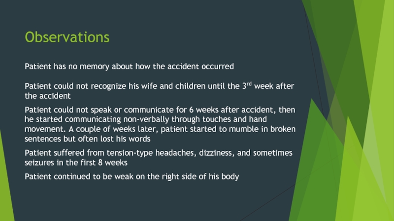 Patient could not speak or communicate for 6 weeks after accident, then he started communicating non-verbally through touches and hand movement. A couple of weeks later, patient started to mumble in broken sentences but often lost his words