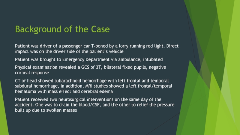 Patient received two neurosurgical interventions on the same day of the accident. One was to drain the blood/CSF, and the other to relief the pressure built up due to swollen masses
