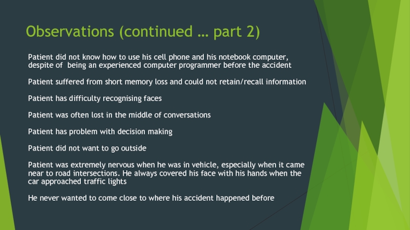 Patient was extremely nervous when he was in vehicle, especially when it came near to road intersections. He always covered his face with his hands when the car approached traffic lights